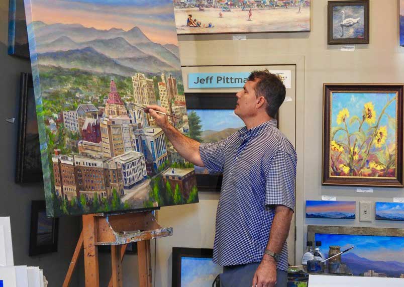 Artist Jeff Pittman is never short on inspiration for his colorful oil paintings. He is primarily known for his dramatic skies, panoramic mountain vistas, and small town area street scenes.