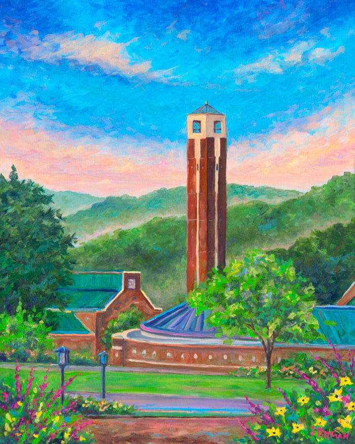 Bell Tower on the Campus of Appalachian State University in the high country of Boone North Carolina. Oil painting and prints on fine art paper and canvas.