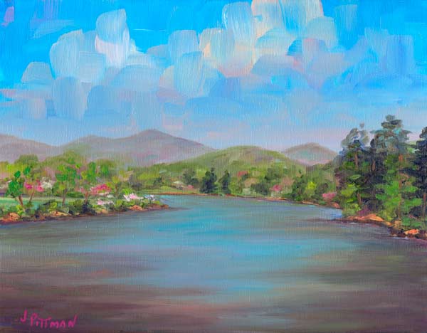 Springtime view across Beaver Lake in North Asheville. Lake painting and fine art print.