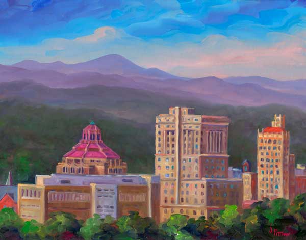 Skyline view of Asheville, NC with the City County building Buncombe County Courthouse and the historic Jackson building.