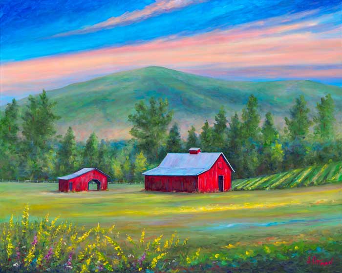 Red Barns along the Virginia Creeper trail near Damascus. Oil painting and prints by River Arts district Artis Jeff Pittman.